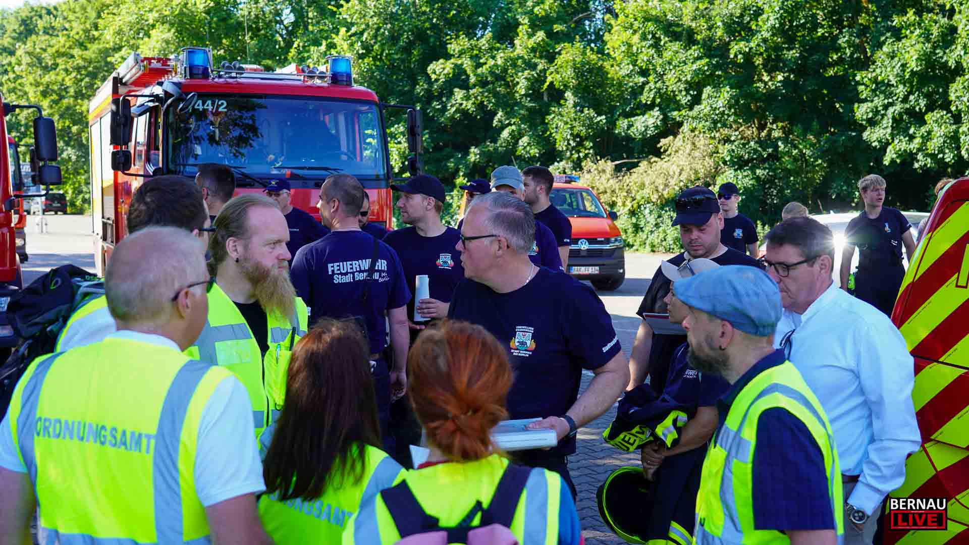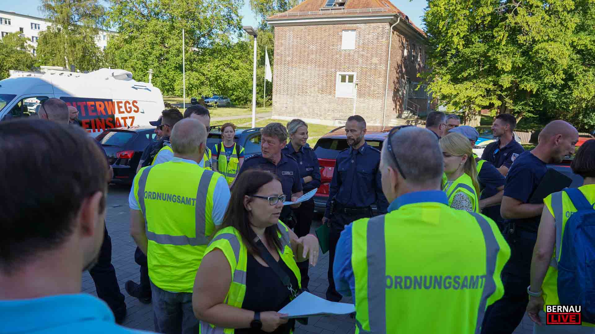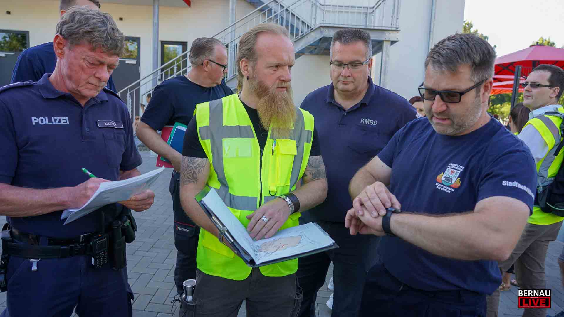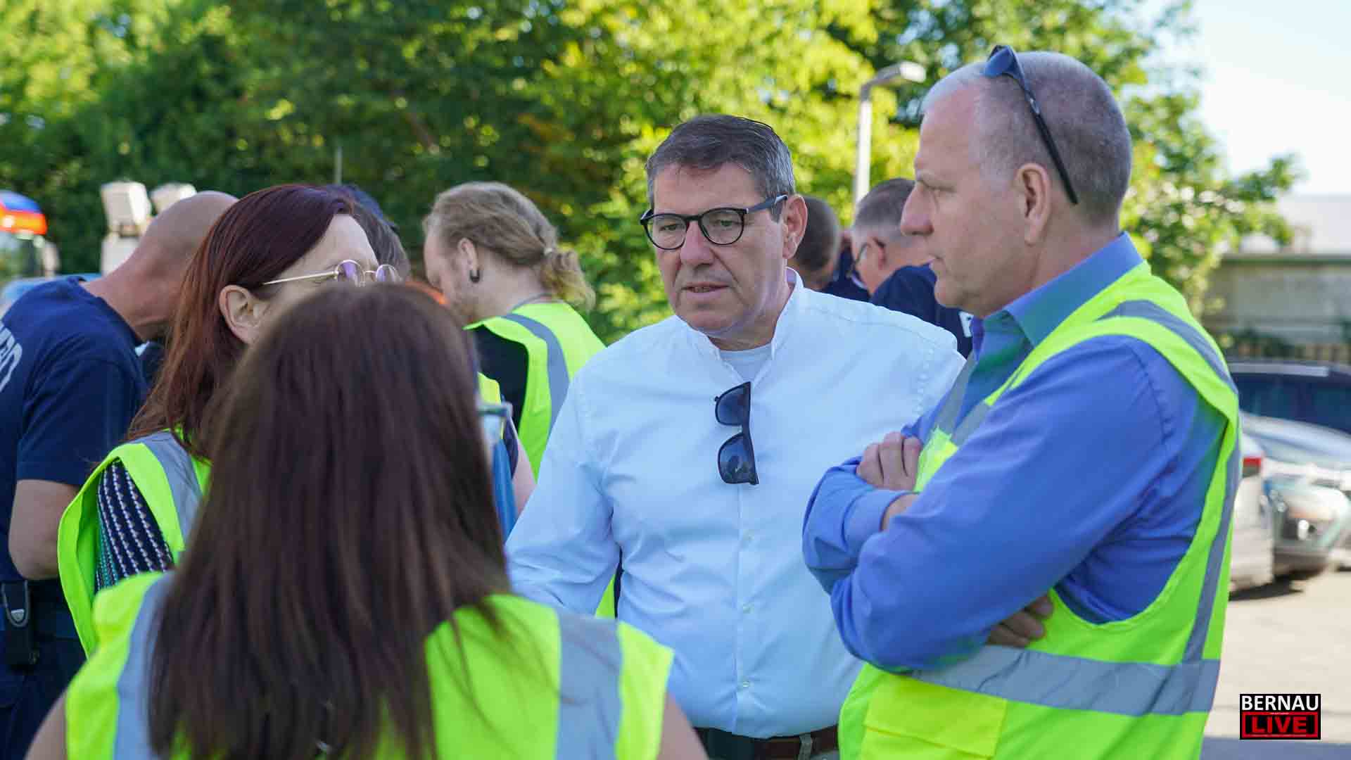 Bereits seit dem frühen Morgen waren zahlreiche Menschen damit beschäftigt, den Sperrkreis einzurichten, ein Lagezentrum aufzubauen und sich um die Evakuierung von Anwohnerinnen und Anwohnern zu kümmern. Bernaus Bürgermeister André Stahl begrüßte die Einsatzkräfte u.a. von Polizei, Ordnungsamt und Feuerwehr und bedankte sich bei allen für die Einsatzbereitschaft, insbesondere auch bei den etwa 70 Einsatzkräften der Freiwilligen Feuerwehren.