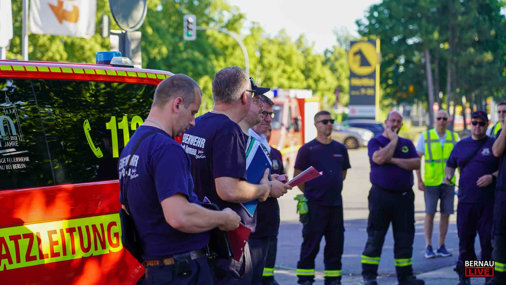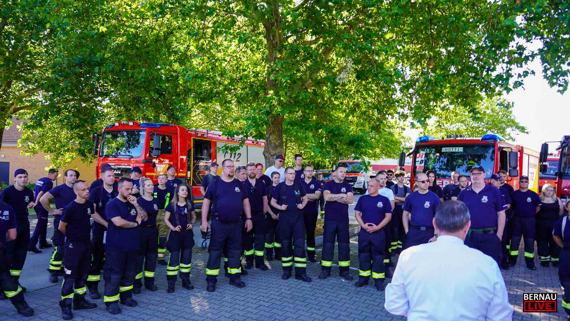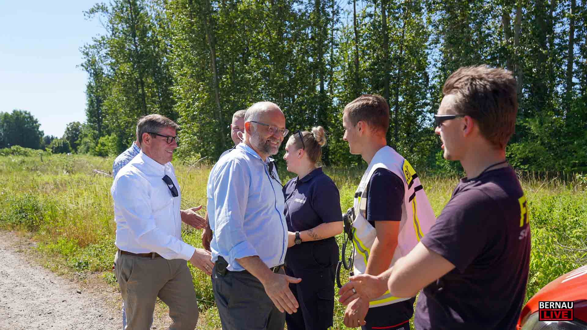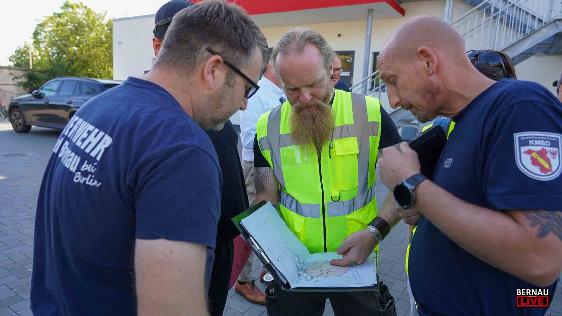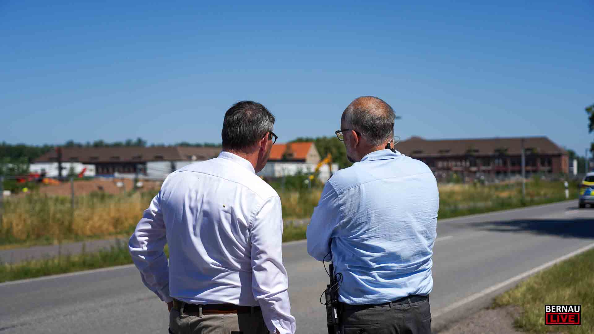 Bereits seit dem frühen Morgen waren zahlreiche Menschen damit beschäftigt, den Sperrkreis einzurichten, ein Lagezentrum aufzubauen und sich um die Evakuierung von Anwohnerinnen und Anwohnern zu kümmern. Bernaus Bürgermeister André Stahl begrüßte die Einsatzkräfte u.a. von Polizei, Ordnungsamt und Feuerwehr und bedankte sich bei allen für die Einsatzbereitschaft, insbesondere auch bei den etwa 70 Einsatzkräften der Freiwilligen Feuerwehren.