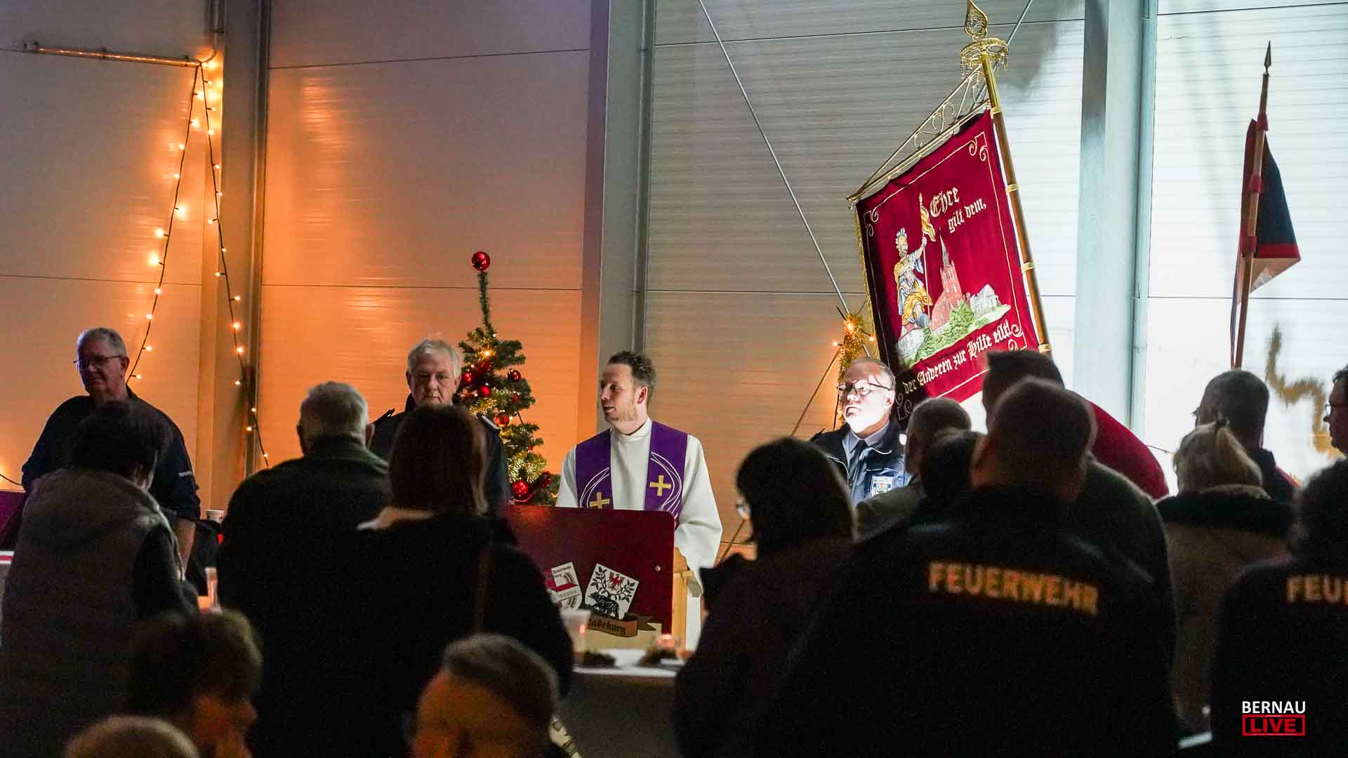 In der weihnachtlich geschmückten Kirche begrüßte Pfarrer Steve Neumann die zahlreich erschienenen Einsatzkräfte, welche auch aus den umliegenden Wehren anreisten. Mit eindringlichen Worten predigte Neumann im Gottesdienst vom Innehalten und sich Sammeln. Gerade in unserer schnelllebigen und ereignisreichen Zeit sehnen sich die Menschen nach Stille und Frieden und besinnen sich auf die wirklich wichtigen Dinge im Leben. Ferner gedachte man den verstorbenen Kameraden und sang gemeinsam Weihnachtslieder.