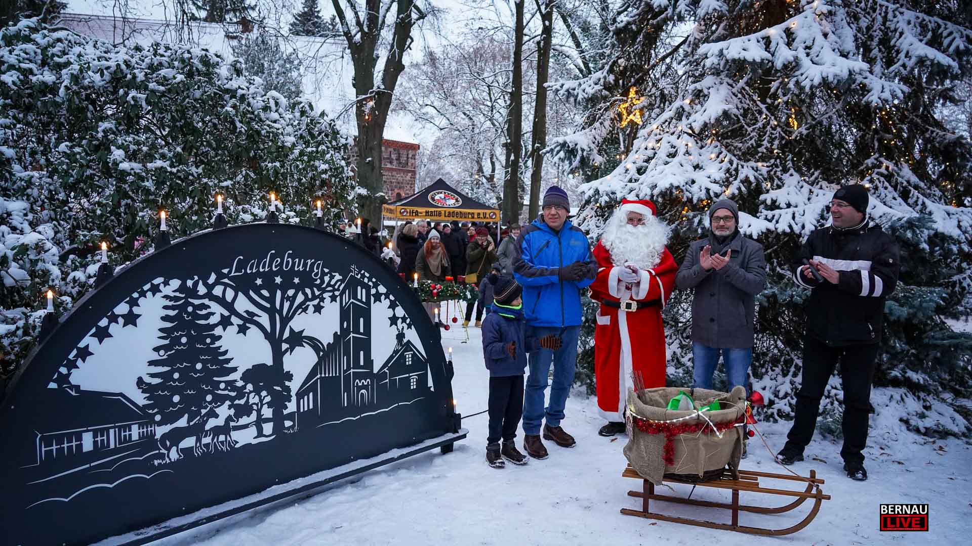 Die Organisatoren haben sich auch in diesem Jahr wieder alle Mühe der Welt gegeben. An zahlreichen Ständen gab es Weihnachtliches, in der beheizten Kirche konnte gebastelt werden, es gab Fotos mit dem Weihnachtsmann, der zwischendurch kleinere Geschenke verteilte und offene Feuer sorgten für eine gemütliche Atmosphäre. Selbst ein kleines Weihnachts-Postamt lud dazu ein, seine Post an den Weihnachtsmann zu richten. Wer den gestrigen Postamt-Standort verpasst hat, kann seinen Brief oder Wunschzettel ab sofort in der Wache der Feuerwehr Ladeburg abgeben. Wie uns die Feuerwehr versprach, werden garantiert alle Briefe beantwortet, die bis zum 20.12. eingeworfen werden. Zusätzlich zum beleuchteten Weihnachtsbaum, der um 16 Uhr durch Jens Thaute, Daniel Sauer, dem Weihnachtsmann und einem Mitarbeiter der Stadtwerke Bernau, angeschaltet wurde, gab es in diesem Jahr einen großen beleuchteten Schwibbogen mit Motiven aus Ladeburg.