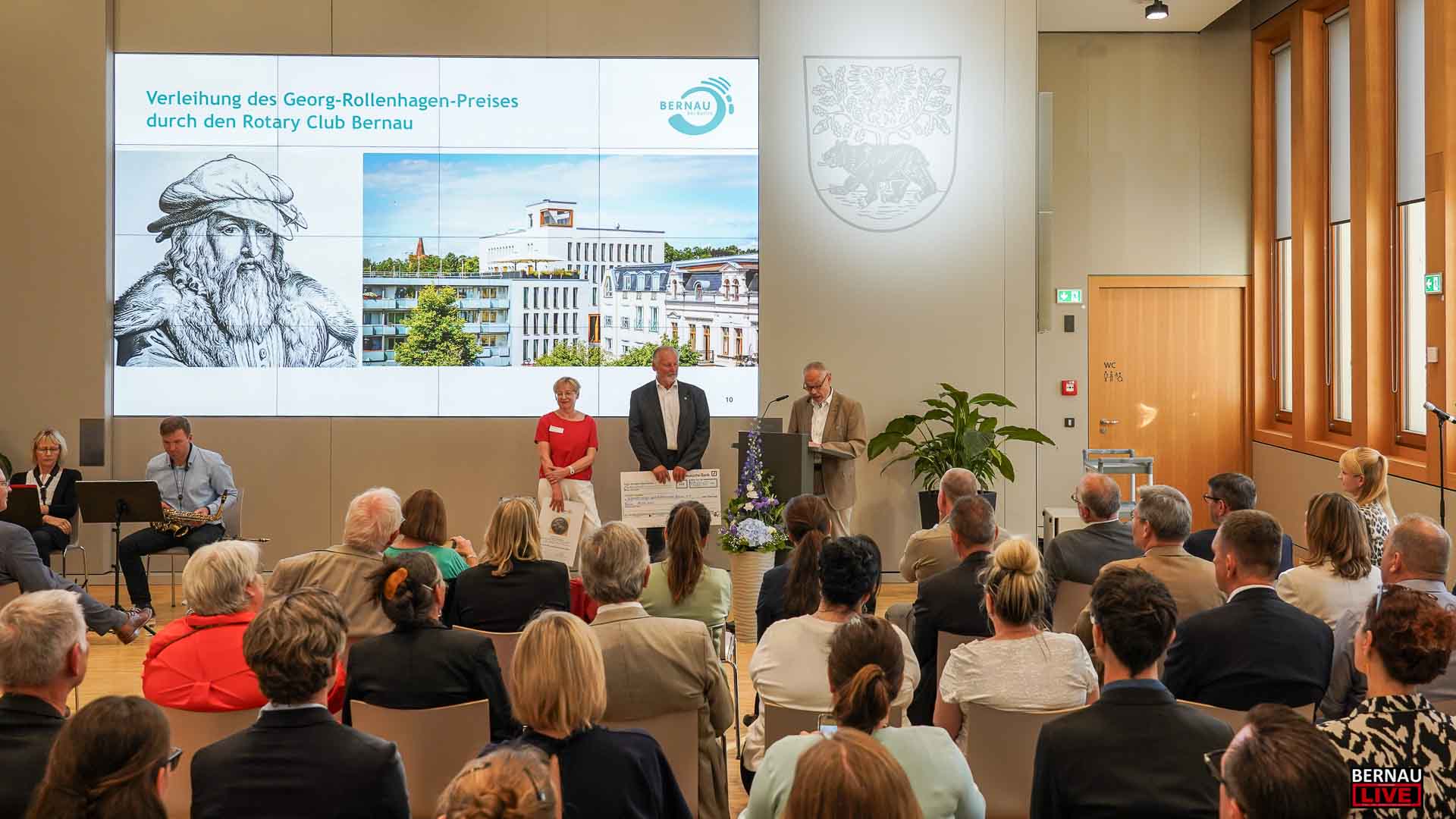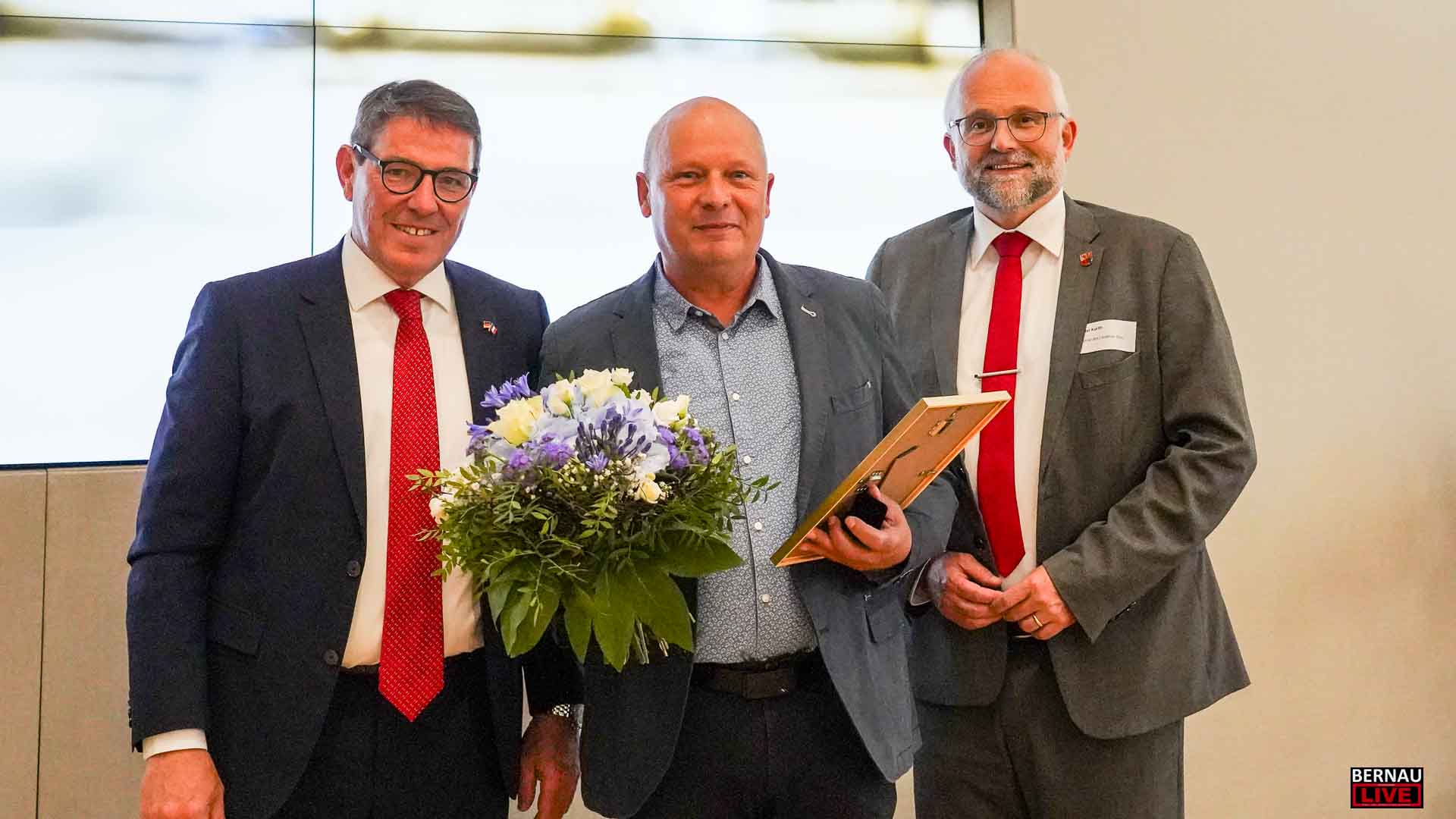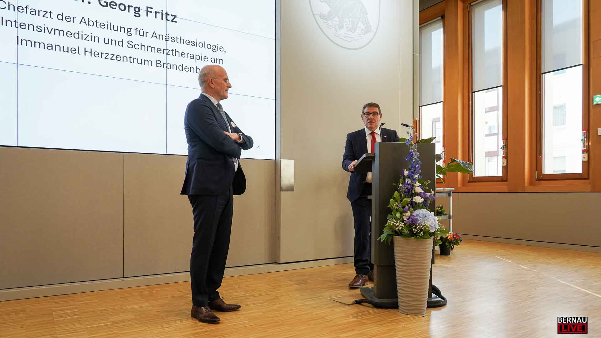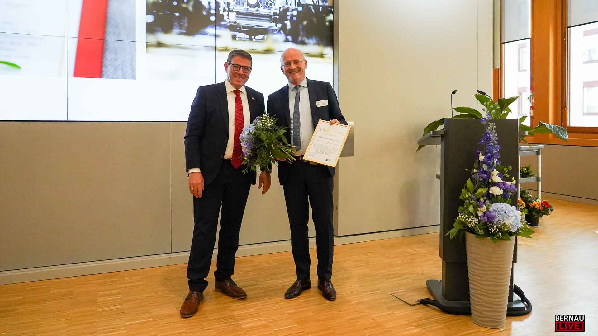 In diesem Jahr erhielten Marcus Naundorf und Dr. Georg Fritz das Ehrenzeichen der Stadt. Marcus Naundorf hat vor 20 Jahren die Firma Naundorf Metallverarbeitung gegründet sowie kürzlich die Naundorf Präzisionsteile GmbH. Die Technik des Bernauer Unternehmens befindet sich in den Stoßstangen der S-Bahn, in Automobilen oder im medizintechnischen Bereich. Der ausgezeichnete Dr. Georg Fritz ist seit vielen Jahren der Chefarzt der Abteilung für Anästhesiologie, Intensivmedizin und Schmerztherapie am Immanuel Klinikum Bernau Herzzentrum Brandenburg. Mit seinem Team nimmt er pro Jahr 5.000 Eingriffe vor und zeichnete sich in der Corona-Pandemie durch ein außerordentliches Engagement aus.